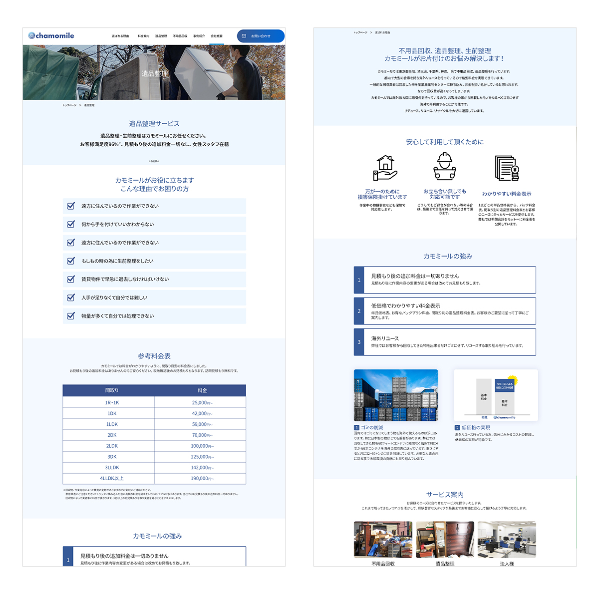 東京都、千葉県、埼玉県、神奈川県の不用品回収・処分、遺品整理・遺品処分事業をされておりますchamomile(カモミール)様のコーポレイトサイト(会社サイト)、サービスサイトを制作しました。