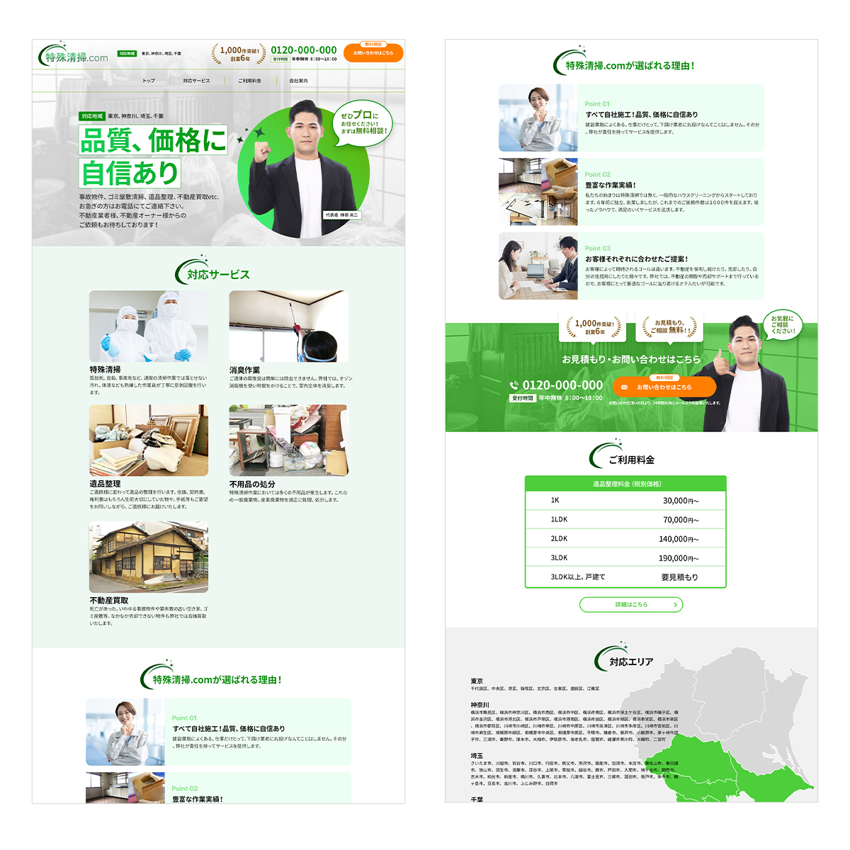 特殊清掃から不動産の買取・再生までをワンストップで対応できる同社の強みが直感的に伝わる構成とし、利用者が抱える不安や悩みに寄り添うメッセージ設計を重視しています。 サービス内容は専門性が高く、心理的ハードルも高いため、サービス内容を丁寧に可視化し、安心感と信頼性を高めるデザインを制作しました。また、問い合わせまでの導線をシンプルに設計することで、初めての方でも迷わず相談できるランディングページに仕上げています。