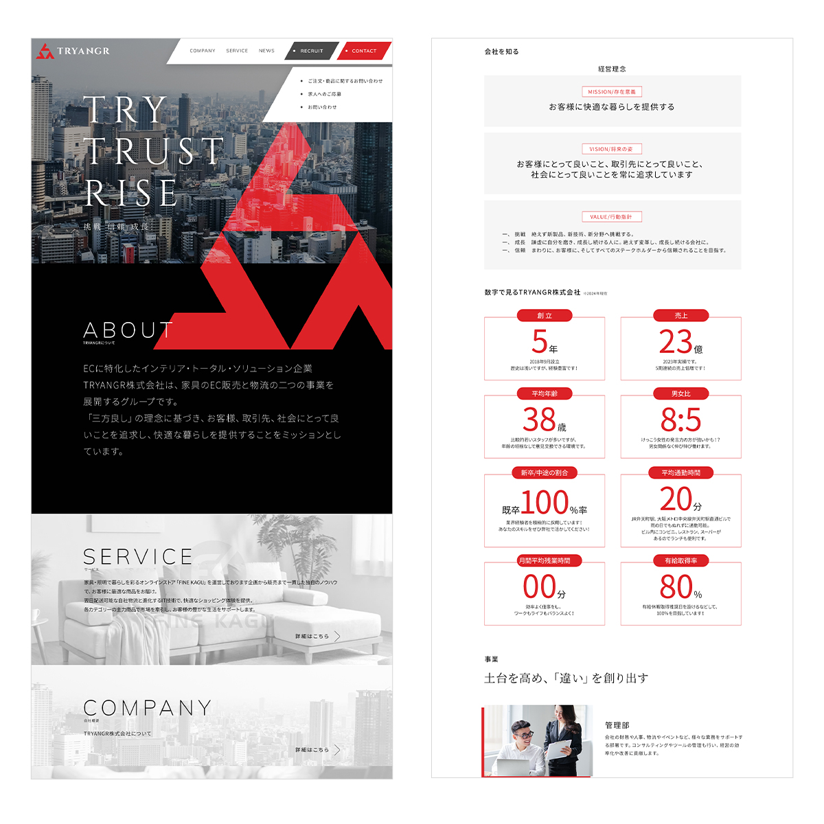 ECに特化したインテリア・トータル・ソリューションを提供するTRYANGR株式会社のコーポレイトサイトを新規で制作いたしました。ブランド戦略から商品企画、EC運用、空間演出までを一貫して支援する同社の強みが明確に伝わるよう、事業全体を俯瞰できる情報設計を行っています。インテリアの世界観や価値観を視覚的に表現するため、余白を活かしたレイアウトと洗練されたビジュアルトーンを採用しました。