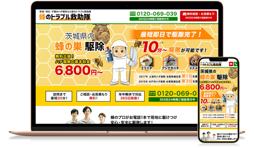 埼玉・千葉・茨城を中心に事業を展開しておられる、蜂のトラブル救助隊のLP(ランディングページ)を新規制作しました。イラスト、ロゴの制作も行いました。